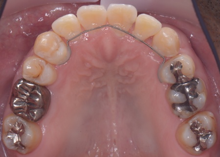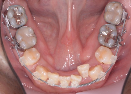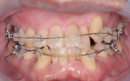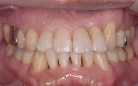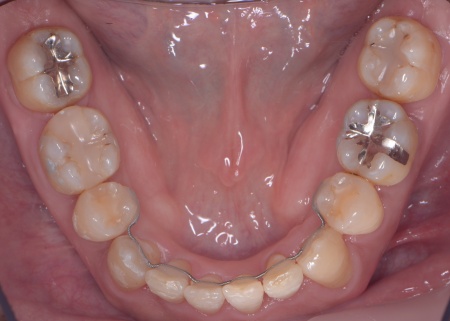 ①抜歯をしてから歯並びを整える「抜歯矯正」 今回のケースでは、左上下の奥歯各1本(第3大臼歯)、右下の奥歯1本(第3大臼歯)、左上下と右下の奥歯各1本(第1小臼歯)の計6本の抜歯が必要です。 また、奥歯の噛み合わせは正常だったことから、それを維持しながら歯並びを整えるために以下の方法を採用します。 ②矯正治療後、歯周病を発症している左下奥歯(第1大臼歯)を温存するために、失われた骨や歯茎を再生する「歯周再生療法」を行う まずは歯の移動スペースを確保するために、計6本の歯を抜きます。 矯正治療終了後、歯の後戻りを防ぐため、上下前歯の裏側にワイヤーを接着して固定させる「フィックスリテーナー」を装着しています。 その後、左下奥歯に歯周再生療法を行って歯周病が改善したことを確認し、治療を終了しました。 |