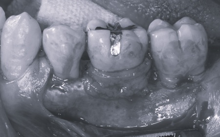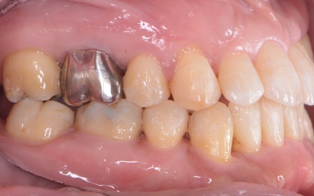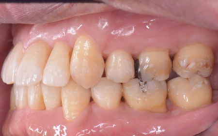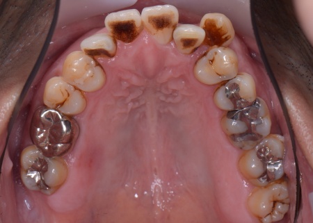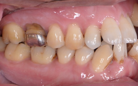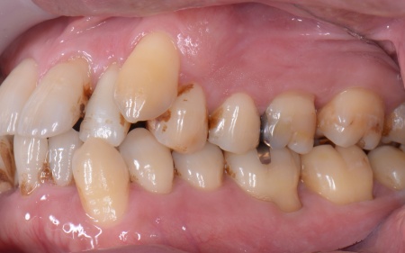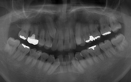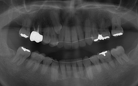 またレントゲン撮影をして確認すると、右上前歯は顎の骨の中に埋まっている骨性埋伏(こっせいまいふく)の状態でした。 さらに、左下奥歯は重度の歯周病であり、歯を支えている骨が一部溶けていることが判明しました。 以上のことから、歯並びを整える矯正治療と歯周病の治療を併せて行う必要があると診断しました。 |