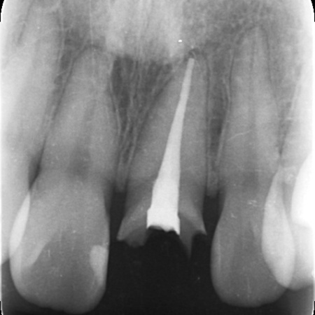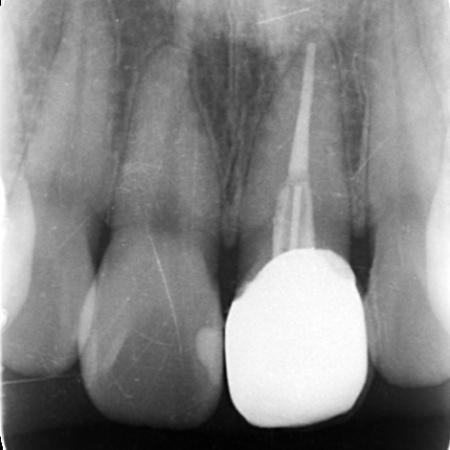 | カウンセリング | お口の中を拝見したところ、左上の前歯が大きく折れて被せ物を支える土台ごと外れていました。 レントゲン検査で確認した結果、歯の根自体には問題がなく炎症も見られなかったため、適切な治療を行えば歯を残せる状態であることが判明しました。 このまま放置した場合、残った歯根に細菌が入り込んで炎症を起こしたり、隣の歯に余計な負担がかかったりする可能性があります。 以上のことから、折れた歯を補う治療が必要と診断しました。 |