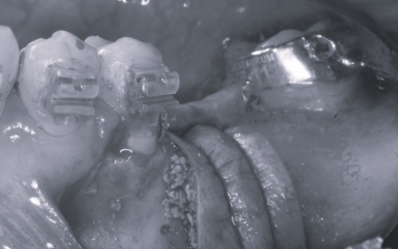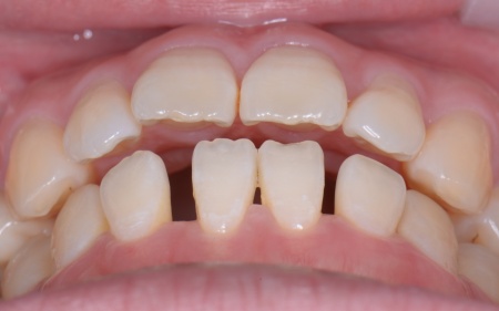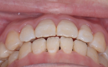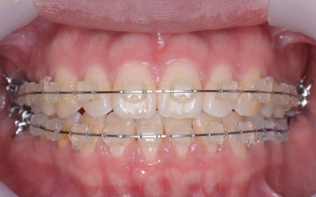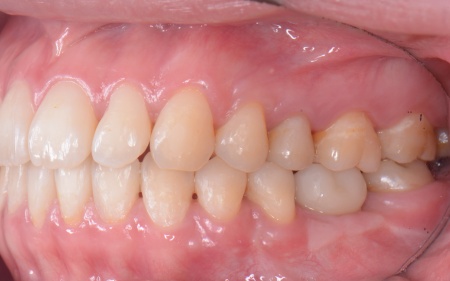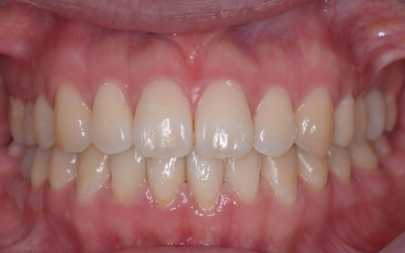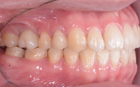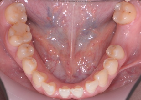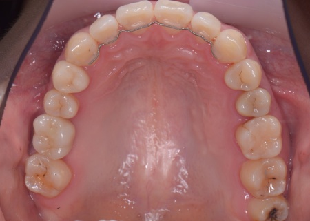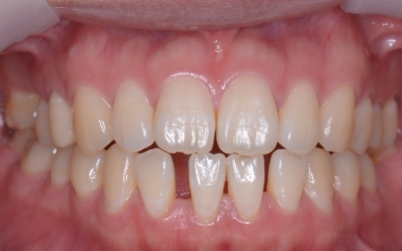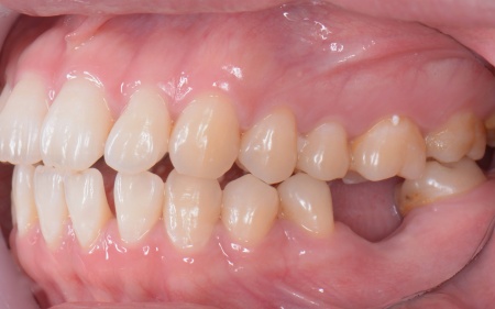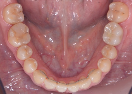 患者様は「健康な歯をできるだけ守りたい」との理由から、③のインプラント治療を希望されました。 まず、右上と左下の奥歯を抜歯しました。 矯正がある程度進んだ段階で、右上と左下のインプラント手術を実施しました。 インプラント手術後は矯正治療の仕上げを行い、装置を外しています。 治療終了後、下前歯の間に見られる三角形のすき間(ブラックトライアングル)が気になるとのご相談がありました。 |