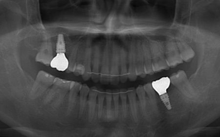 | カウンセリング | 拝見したところ、右上と左下の奥歯に強い痛みが出ていました。 レントゲンで確認した結果、どちらも歯の根が割れていることが判明しました。 歯の根が割れたまま放置すると噛むときの痛みが続くだけでなく、炎症が広がって周囲の歯や骨にまで影響を及ぼすおそれがあります。 また、上下の歯を噛み合わせた際に前歯が噛み合わず隙間ができる開咬(かいこう)と呼ばれる噛み合わせも見られました。 以上のことから、抜歯後に歯を補う治療と噛み合わせを改善するための治療が必要と診断しました。 |
