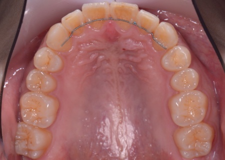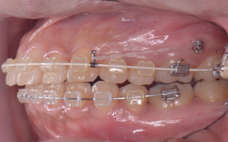 メリット デメリット 患者様は、上奥歯が通常より前側に生えており、上下の噛み合わせに前後差がある「アングルⅡ級」という状態でした。口元のバランスをしっかり整えることを考えると、上下奥歯(小臼歯)を抜く治療が適切ですが、患者様は非抜歯矯正を希望されました。 まず、上下の歯には白くて目立ちにくい「セラミックブラケット」を接着します。上顎のみ審美性の高い白いワイヤーを使用して、矯正治療を開始しました。 次に、上顎の左右に歯を後方へ移動させる際の固定源となる小さなネジ「アンカースクリュー」を埋入します。 矯正終了後には、歯ぎしりが原因で大きくすり減っていた犬歯に対し、樹脂で形を整える「コンポジットレジン修復」を施しています。 続いて、歯並びの後戻りを防ぐため、上下前歯の裏側に固定式の保定ワイヤー「T‑fix」を装着しました。 |