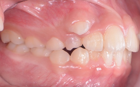 | カウンセリング | 拝見したところ、上の犬歯が歯列の外側に飛び出すように生えている、いわゆる八重歯でした。 さらに、上下の歯全体がデコボコに生えている「叢生(そうせい)」と呼ばれる状態で、これは歯が正しい位置に並ぶためのスペースが不足していることが原因だと考えられます。 このまま放置して顎の成長が完了してから矯正治療を行う場合、歯を並べるスペースを確保することが難しく、永久歯を抜く処置が必要になるケースがあります。 以上のことから、今の段階で歯並びを整える治療が必要だと診断しました。 |