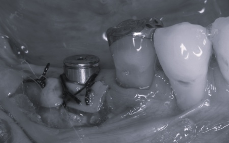 患者様は「できるだけ治療期間を短くしたい」と希望されていることから、右下の第1大臼歯は抜歯即時埋入インプラントを提案しました。 抜歯即時埋入インプラントとは、抜歯と同日に人工歯根「インプラント体」を埋め込む方法です。 これにより、通常のインプラントと比べて治療期間を短縮することができます。 なおこの方法は、骨の量・質・感染の有無・歯ぐきの状態などの条件があり、すべての症例で行えるわけではありません。 また、大臼歯周囲は、歯の周りを保護する硬い歯ぐき「角化歯肉」が不足していました。 手前の小臼歯については「同じ歯の治療を繰り返したくない」とのご希望から、精密補綴治療を提案しました。 それぞれの治療内容を丁寧に説明したところ、すべての治療に同意いただきました。 まず、大臼歯の抜歯から行います。 次に、小臼歯に関しては古い詰め物を取り外し、マイクロスコープを用いて拡大視野のもとで歯の形を整えて型を採り、精度の高いセラミックの被せ物を作製・装着しました。 |